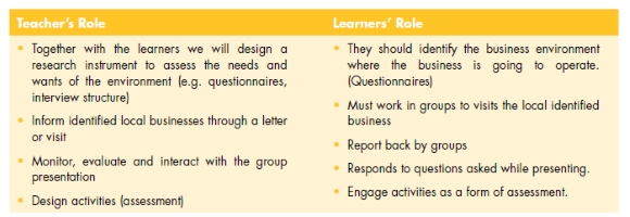 After analysing lesson plans for Business Studies designed by subject-advisors, one can clearly differentiate the roles of the teacher and learners for every lesson. Each step of the lesson has clear activities for the teacher and learners. These activities are determined and linked with learning goals, as well as designed to help learners achieve desired outcomes. The table below adapted from the Department of Education, Eastern Cape Lesson Plan Business Studies 2009 outlines the activities of the teacher and learners that will be done during the lesson. This clearly shows how the teachers plan to incorporate learners in the lesson and make sure that they have work to do from the beginning to the end.