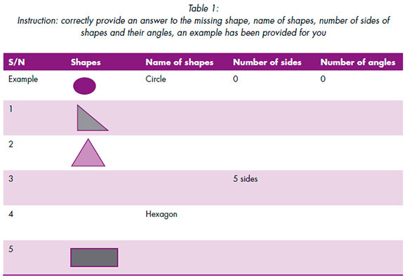 The research paradigm used for this study was quantitative while a quasi-experimental design was used. In this study, a pre-test, post-test non-equivalent control type was adopted to examine the data collected. The total population of primary 6 learners (aged 9-10) from nine different private primary schools in Owerri West local government areas of Imo State, Nigeria was 3 266. In selecting the research participants, a sample size of 165 learners, made up of 75 males and 90 females from two randomly selected private primary schools, was used for the study. From each of the selected schools, two classes were chosen at random and further classified into experimental and control groups, respectively. The experimental group was made up of 81 learners (47 females and 34 males) while the control group had 84 learners (43 females and 41 males). The instrument for data collection was a test made by the researchers. The researchers formulated 30 item-objective test questions titled: 'Mathematics Achievement Gain Test' (MAGT). It was drawn from the topic '2D shapes and their properties'. The learners were taught the basic concept in identifying a 2D shape. Thereafter, the properties of 2D shapes were taught. Among the 2D shapes that were taught are circle, right-angle triangle, equilateral triangle, Isosceles triangle, scalene triangle, square, rectangle, rhombus, parallelogram, trapeze, pentagon, hexagon, heptagon, among many others. The objectives of the lesson were, cognitively, for learners to (i) correctly detect properties in each variety of 2D shapes, (ii) correctly recognise the different types of angles and their shapes, and (iii) become familiar with how lines form angles. The construction of the test instrument was guided by a table of specifications endorsed by two experts, one in mathematics education and the other in measurement and evaluation. An example of the test items is shown in the table below.