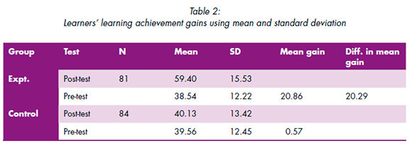 Results from Table 2 below reveal that the experimental group had 20.86 as the mean achievement gain unlike the control group which barely gained 0.57. This result shows that the experimental group was 20.29 higher than the control group.