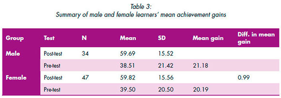 In Table 3, it is shown that males in the group had a mean achievement gain of 21.18, whereas the females in the group had 20.19 mean achievement gain. With a very slight mean difference of 0.99, the males in the group learned better than the females.