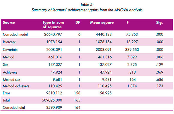 Table 5 gives 7.829 as the calculated f-value for method, and this is greater than the table value which stood at 93.847. Also, the p-value is 0.006 and it is less than the 0.05 oc-value. Therefore, the null hypothesis is rejected and the alternative accepted following from the result. The implication of this is that the mean achievement scores of the learners taught mathematics using a blended-learning instructional method and those taught conventionally show a significant difference.