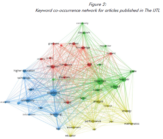 Keyword analysis was used to understand the research themes and topics in articles published in The IJTL. Keywords co-occurrence shows the research hotspots in a research field. The keyword cooccurrence analysis is an efficient and essential instrument that supports knowledge mining and provides a view of the research trends (Li et al., 2016). The keyword analysis was performed by extracting terms from the titles and abstracts of the articles. Full counting was used to count all term occurrences, and the threshold was set to 1 5. There are 3699 keywords in the titles and abstracts of the articles published in the journal from 2008 to 2022.