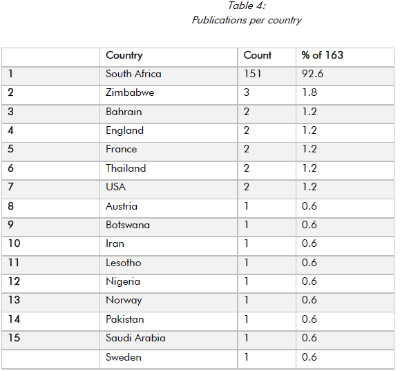 Authors from 16 countries published 163 articles. Of these, five are African countries, Europe has five countries, the Middle East has three, Asia has two, and the Americas has one. Table 4 shows the articles shows the contributions of the authors. As shown, authors with institutional affiliation with institutions based in South Africa (151) dominate, accounting for nearly 93%, followed by Zimbabwe (3), accounting for nearly 2%.