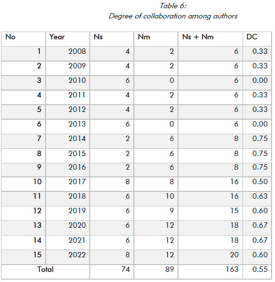 Table 6 shows the DC among authors with articles published in the journal between 2008 and 2022. There was no collaboration in the articles published in 2010 and 2013, as they were all single-authored. The highest DC was achieved in 2014, 2015 and 2016 with a value of 0.75, followed by 0.67 in 2020 and 2021. It is also seen from the table that the years 2008, 2009, 2011, 2012, 2017, and 2022 fall below the average DC (0.55). Overall, the DC for the articles published by The IJTL is 0.55. It means that slightly more articles are co-authored than single-authored.