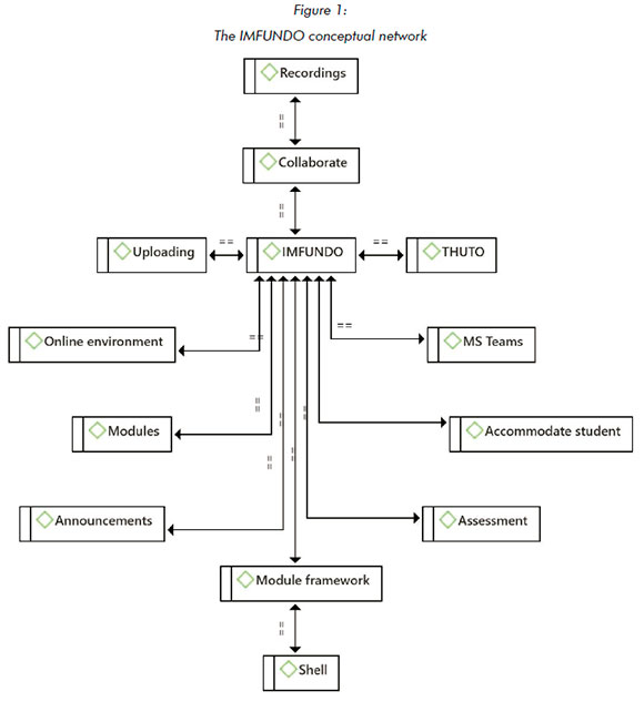 Academics were requested to respond to the question: How did you experience the IMFUNDO continuous professional development? From this question, the researcher generated 13 codes clustered into the theme IMFUNDO. Figure 1 shows the conceptual network IMFUNDO. It was found that the academics appreciated the opportunity to attend the OCPD on the learning design of online modules using the IMFUNDO. Dr Mtshali indicated that IMFUNDO offered a world-class platform for teaching and learning, and he was able to incorporate the practical component of the module on this platform. Mrs Mokoena reported that the IMFUNDO system offered more opportunities. Literature revealed that to upskill academics in digital delivery and improve the student experience, staff development is essential to ensure that specialised assistance for technology-enhanced learning is provided (Sumer, Douglas & Sim, 2021).