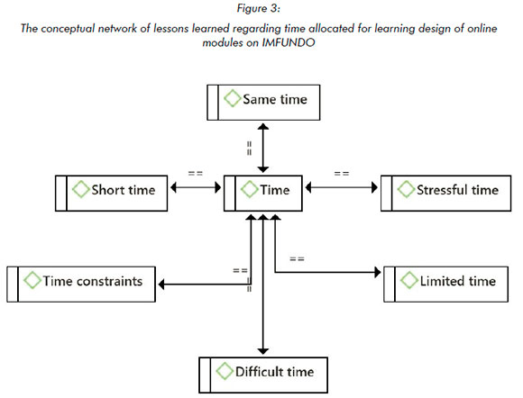 Academics were requested to respond to the question: How will you evaluate the time given to prepare the learning design of your online modules on IMFUNDO? The researcher created seven codes from this question, grouped into the theme 'Time'. Figure 3 shows the conceptual network of lessons learned regarding time allocated for learning the design of online modules on IMFUNDO. It was discovered that the University allocated academics three months to design and develop their online module on IMFUNDO. The IDs were responsible for this task as they worked closely with the subject matter experts. Dr Mooi revealed that he attended all of the online sessions. He made time for it because he believed the time was allocated to prepare his modules on IMFUNDO. As academics, they needed to make positive or constructive use of the available time. Literature indicates that to become digitally literate, academics should evolve into new roles and acquire new skills and competencies that go beyond basic technical proficiency (Evans et al., 2020).