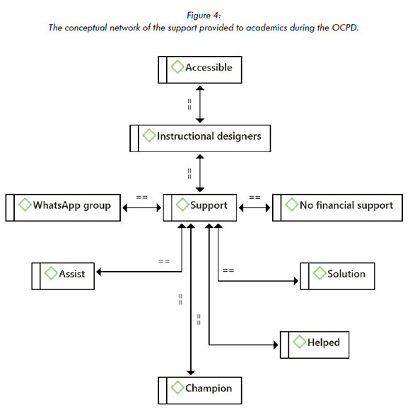 Academics were requested to indicate the support they received regarding designing, developing and implementing their online module. The researcher created nine codes from their responses in this regard, grouped into the theme 'support'. Figure 4 illustrates the conceptual network of the support provided to academics during the OCPD.