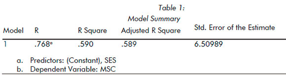 Table depicts R2 = .589. In essence, parent's socio-economic status constitutes 58.9% of mathematics self-concept. Almost 60% of mathematics self-concept is explained by or accounted for by socio-economic background of the students. This implies that socio-economic position is a strong determinant of mathematics self-concept.