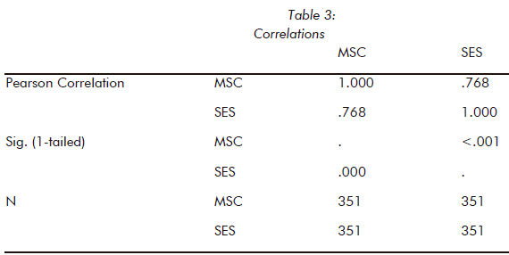Table 3 reflects that p <.001 and F (1.349) = 502.9. P-value is below .05 this shows that the regression model in table 1 is statistically significant. Parent's socio-economic status predicts mathematics self-concept, and the prediction is statistically significant. The following analysis shows correlation between the two variables of interest.