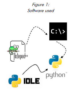 In the context of this study, Python 3 is the programming language students are using to learn to code. Python is an interpreted language, and one can run simple Python expressions and statements in an interactive programming environment, or the shell. The Integrated DeveLopment Environment (IDLE) is the environment that comes with the Python installation (Lambert, 2018). When launching IDLE, the Python Shell opens to make an editor available - to write a script and access the Python interpreter. In addition, an editor, Notepad++ is made available to students, and they are guided to use the Windows command-line to run Python commands. All the necessary software (Figure 1) is free to download and use.
