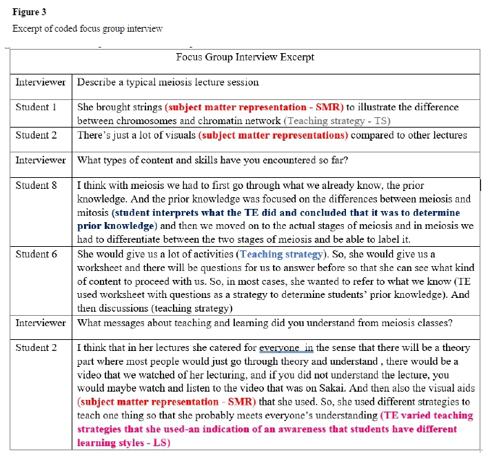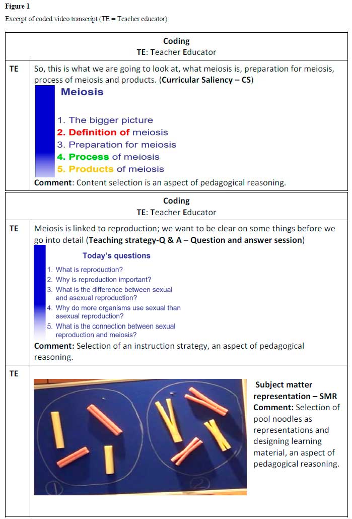 Data sources for this study were video recordings of three 50-minute meiosis lectures taught by the teacher educator, and video-stimulated recall (VSR) interviews with the teacher educator to determine the pedagogical reasoning behind the practices observed in the lectures. Audio-recordings of focus group interviews with the PSTs were also collected, which aimed to determine their experiences of the lectures and to see what pedagogical practices they had learned from the course. Although the average number of participants in focus group interviews is usually between four and six, our focus group interview consisted of 15 participants. This is because when we approached the class with the request, 15 PSTs showed interest and consented to taking part in the interview. All 15 then indicated that they wanted to do the interview on the same day, after class, and be done with it because it was the last day of the genetics lectures. Seeing their immediate availability and readiness to do the interview, we could not divide the group and send others away to find another time for the interview. Therefore, we decided to interview all 15 PSTs at one go. In order to overcome the negative effects of large focus groups, we made sure to give each PST an equal opportunity to express their opinions. This was done by allowing each PST to respond to the questions that we were posing and to say what they wanted to say. Allowing each participant to have a voice helped to reduce bias within the interview.