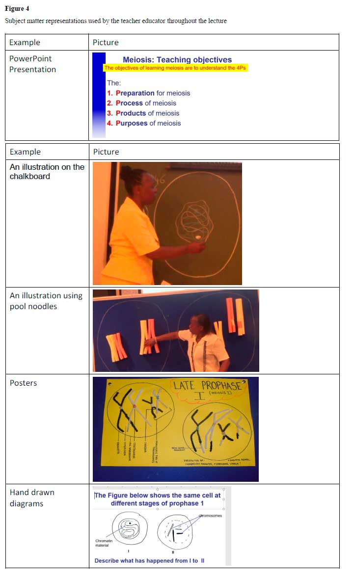 Other subject matter representations used by the teacher educator to demonstrate certain processes were strings and posters. These, along with question-and-answer sessions, were used to represent the importance of the formation of chromosomes because these concepts are often difficult for PSTs to understand. The teacher educator used analogies throughout the lecture in order to give PSTs the ability to relate new concepts to experiences that were familiar to them. As the teacher educator said: