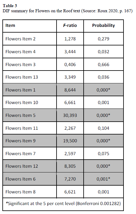 Table 3 presents a summary of the Flowers on the Roof items that displayed DIF across the English, Afrikaans, and isiZulu languages. An ANOVA test is included in the DIF summary. This table offers evidence as to whether the mean scores of each language are indeed comparable.
