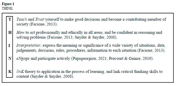 An approach to deepen students' knowledge and understanding of the five elements of THINK was used to assist them to demonstrate critical thinking skills. The definition of "critical thinking" was developed in the context of accounting, using the top category of Bloom's taxonomy (Anderson et al., 2001; Krathwohl, 2002), and "create" was used in relation to thinking creatively, teaching, and trusting yourself to make good and ethical decisions-especially in the wake of some recent corporate accounting scandals. Thus, critical thinking also includes interpretation and especially, sifting and filtering through data to extract the correct data to make decisions, report problems, find solutions, interpret data, and make judgements (Facione, 2013). Another important aspect is to engage and participate effectively (Papageorgiou, 2021; Precourt & Gainor, 2019). And finally, including critical thinking in education programmes could assist with students' higher order thinking skills, linking theory learnt with application (Lorencová et al., 2019).