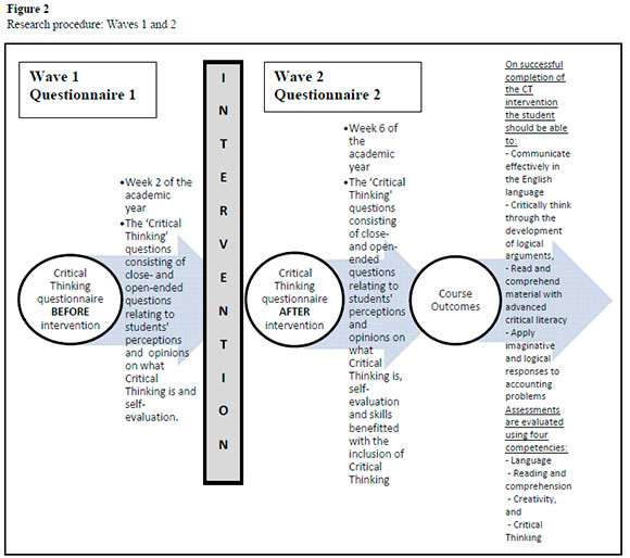 The second wave was administered in Week 6 after the critical thinking interventions. The critical thinking questions consisted of closed- and open-ended questions relating to students' perceptions and opinions on what critical thinking is, self-evaluation, and their skills benefitted by the inclusion of critical thinking. Students' critical thinking skills were tested at the end of Week 7 by using a formal written assessment on the work done in the critical thinking lectures. Students were briefed on what material had to be prepared for the assessment. On successful completion of the critical thinking components, the students should have developed or gained critical thinking skills (see Figure 2). Students were assessed by using the following criteria: to be able to answer open-ended questions, relate to real-world scenarios, ability to apply theory to new situations, ability to compare different situations, ability to sift through data to make judgements, and reasoning skills in solving problems. Examples of two questions are as follows.