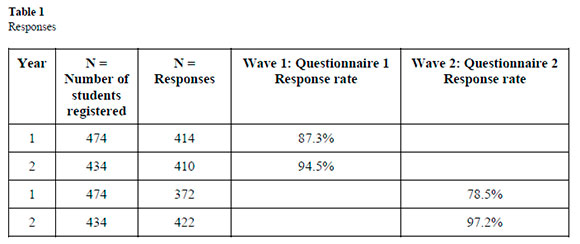 A total of N = 1,618 responses were recorded-an average response rate of 89.4% for the four questionnaires over the two years. A total of 908 students were registered for the course over the two-year period (Year 1 = 474, Year 2 = 434). There were two questionnaires per year and responses were as follows: Questionnaire 1, Year 1 = 414 and Year 2 = 410; Questionnaire 2, Year 1 = 372 and Year 2 = 422. See detailed responses presented in Table 1.