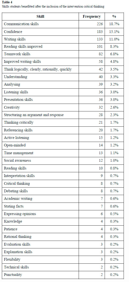Students had to each name three skills that they had benefitted from being exposed to the critical thinking interventions. The qualitative data were analysed using an Excel spreadsheet, and N = 2,014 benefits in skills were recorded. The benefits in skills students experienced after the inclusion of the intervention, critical thinking, were grouped in different skill categories as per Table 4. The highest ranked skill was "Communication skills" (18.7%), and second highest, "Confidence" (15.1%; some students indicated "Self-confidence" because it was grouped under the theme, "Confidence"), and the third highest "Writing skills" (11.0%). The category, "Improved Writing skills" (4.8%), was reported separately to "Writing skills" and not combined because with the inclusion of critical thinking interventions in the accounting curriculum, some writing skills were "Developed" while others "Improved."'
