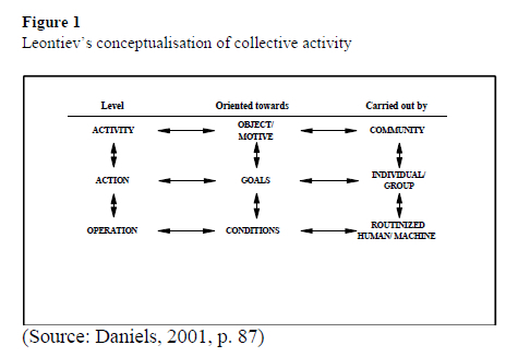While Vygotsky (1962/1986) clearly recognised the importance of the social world in development, he did not conceptualise collective activity in depth. Leontiev (1981), his colleague, took up the challenge of situating (individual) action within a collective activity. While individual actions are goal directed, collective activity is motive driven. To understand the individual action, then, one would have to know what motivates the entire activity. This is represented in Figure 1.