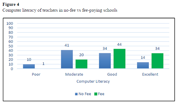 Figure 4 illustrates the level of familiarity regarding ICT use in fee-paying versus no-fee schools. These results indicate that 44% of teachers in fee-paying schools reported that they had good ICT skills and 34% noted that they had excellent ICT skills. Contrasting this with 34% and 14% respectively of good and excellent ICT skills reported by teachers in no-fee schools, one might well anticipate that teachers in fee-paying schools would be more likely to use ICTs for teaching. Moreover, these schools also have greater access to ICT resources and are able to afford connectivity and devices. While initiatives like the Khanya project in the Western Cape (2000-2004) saw computers delivered to some well-functioning, no-fee paying schools, there is research indicating that connectivity and access to devices is lacking in schools in lower socio-economic areas where no-fee schools are located (Mukuna & Aloka, 2020)