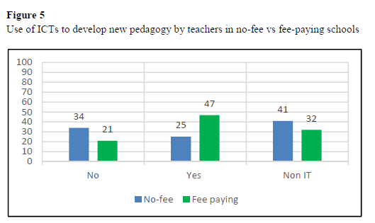 As noted in Figure 5, 47% of teachers in fee-paying schools indicated that they used ICTs to develop new pedagogies during the pandemic as distinct from 25% in no-fee schools. It is interesting to note, however, that non-ICT tools were used more in no-fee paying schools for pedagogical reasons (41%) than ICTs (25%). This should not lead to the conclusion, however, that ICTs did not alter pedagogy in no-fee schools. As we will show in the analysis that follows, two distinct novel pedagogical types emerged from the data and surfaced in both no-fee and fee-paying schools.