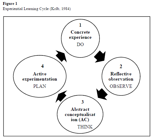 3. Abstract conceptualisation (AC): The activity is for the learners to conceptualise a theory from what they have observed during the experience. At this stage, learners link the experience to theory or concepts learned from textbooks or in the classroom (Kolb et al., 1999).