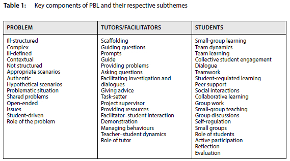 Thematic analysis is an approach to qualitative data analysis which involves organising collected data into themes and categorising these so as to better understand the collected dataset (Norton, 2019; Kiger & Varpio, 2020). Thematic analysis is one of the qualitative data analyses used by researchers in qualitative research: the researcher commences by familiarising themselves with the dataset, which entails repeatedly and actively reading through the articles included. This process provided a valuable orientation to the dataset. The researcher then undertook a preliminary synthesis to derive the broad themes inductively, which involved searching for the key components of PBL in the included articles. The choice of using thematic analysis was based on the purpose of the study and on Kiger and Varpio's (2020) assertions. The examination of repeated terms or concepts, concepts with closely linked meanings, text manipulations using cut-and-sort, and, in certain cases, text being highlighted with different colours for each topic, were all employed in this study to find themes in the data. After taking into consideration the core words in the research question and going through whole datasets accordingly, three main themes emerged: the problem, the facilitator or tutor, and the students. Subsequently, subthemes also emerged, as shown in Table 1.