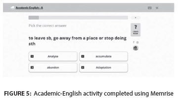As the initial step of implementing Memrise, Author One introduced the application to students and engaged them in academic-English learning through memory games with specific tasks they had to complete. Screenshots illustrating Memrise activities are depicted in Figures 4, 5 and 6.