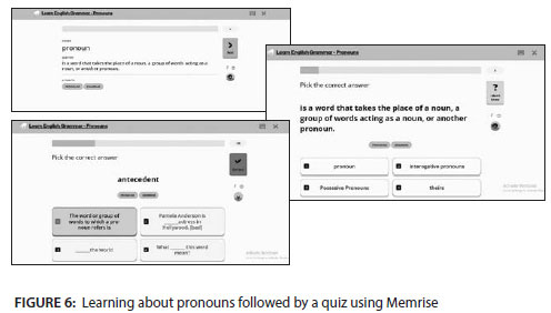 Figure 6 shows one category of learning English using the Memrise application. There are around 380 different categories that students need to encounter in order to grasp English grammar and language more fully. The screenshots illustrate students engaging with the section titled English Grammar - Pronouns, where they completed quiz questions aimed at enhancing memory retention and learning efficiency.