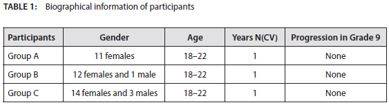 In order to maintain confidentiality, the names of the students were not used. Table 1 shows the participants' profiles for gender, age, years doing the N(CV) programme, and if they had progressed in Grade 9. The sample comprised all of the students who were taught English by the lecturer (Author One), making a total of 40 students: 37 females and three males aged between 18-22 years old, along with Author One as a participant. All the participants were studying English Level 2 at the time and Author One was also a participant in this study as she was actively implementing an innovative teaching strategy in her English classes.