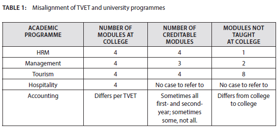 While other departments had not performed curriculum mapping, HRM had done so and had found that college content overlapped between the first- and second-year levels for some of the four modules where credit transfer was usually enabled. This overlapping content represented over-alignment,1 and also an underdeveloped credit potential,2 if not an overload of the college content. NCV Level 4 in Tourism, according to interviewee Josh, was under-aligned3 in relation to the content of the first-year curriculum at university. Josh, carrying an academic transcript of a student from a certain TVET, suggested this under-alignment and articulation dynamic in the following words: 'If you check these subjects they are doing there and compare them with the ones that are done here [at the university], there is no alignment.'