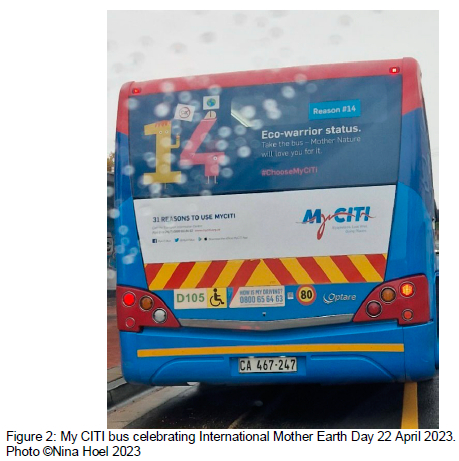 The feminization of earth and nature is not necessarily archaic or out-of-sync with contemporary society, as many may think. We find similar symbols and illustrations in popular culture as well as throughout political discourses. In 2009, the UN established the International Mother Earth Day (22 April) to remind the world population that the earth gives us life and sustenance. In Cape Town earlier this year (2023), International Mother Earth Day was marked, amongst other events and performances, by the My CITI bus service, which proudly proclaimed "eco-warrior status" and drove around the inner city carrying the slogan: "Take the bus - Mother Nature will love you for it."