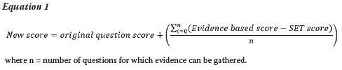 The second avenue involves a statistical re-weighting of the SET scores for the lecturer based on the magnitude of the difference between the score that would align with empirical performance, and the score averaged from students' responses. For example, if a lecturer attends every contact session early but receives an average score of 7.8 for that question, a deviation of 2.2 would be calculated. This deviation would represent the discrepancy between the empirical and perceived performance in this category. Using the logic of the spillover effect (Mengel et al., 2019), it could be anticipated that a similar level of deviation would apply to all questions and the overall SET score. The difference could then be scaled to each response, and to the mean score (Equation 1). To strengthen this approach, the deviation for all three questions could be calculated and averaged, and this average deviation applied to the remaining questions and the average score.