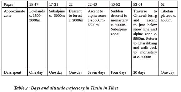 Page reference is essential for page progression analysis while place location (including country, region, town and altitudinal band) is essential for spatial and mountain literacy analysis. Altitudinal bands indicate the influence of climate on vegetation. This research also considered the settlement or urban geography and biogeography/ meteorology evident in the comic book. Associated with urban form is culture, which is evidenced by behaviour, sayings and even attire. Attire and equipment indicate temperature and risk, for example the need to have ice axes and crampons. Danger and risk feature most strongly in the pages dedicated to accessing the Himalaya and especially the plane crash site. Mythology is dedicated to the sighting and experience of the Yeti. Speed of movement relates to the passage of the climbers through varying terrain and the time it takes them to complete the passage. Passaging through deep and also hardened snow is an extremely laborious process. Spatial and mountain literacy skills formation were evident where Tintin was faced with a space or mountain situation and adapted accordingly. While imagery has been covered to some extent in the categories above, it is apposite to elaborate upon it, as imagery is integral to comics.