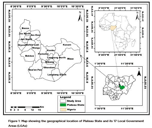 The study area of the present research is Plateau State in Nigeria (Figure 1). Its total population is approximately 4,075,392 and has an active GSMT capacity of about 3,557,374 subscribers, together with an active internet base connection that caters for 2,431,338 subscribers (National Bureau of Statistics, 2020). The rugged topography of the area presents challenges for siting mobile phone base stations (Quinteros, 2023). Additional infrastructure and specialized planning may be required to optimize signal distribution and overcome the obstacles posed by the terrain (Quinteros, 2023; George, 2024).