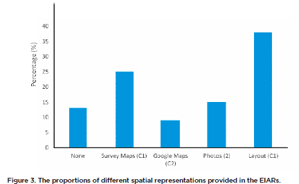 The proportion of technical layouts and engineering design sketches was highest at 38% (i.e. 261 sketches in 58 EIARs) while Google Maps (9%, 62 maps) featured in only 29 EIARs. These types of spatial information fall under Category 1 and Category 2 in terms of their degree of visual realism, respectively. The Google Maps images were more commonly used than topographic maps, and they exhibit a higher level of visual realism which is an advantage that enhances their interpretation for users. By contrast, some EIARs (13%, n=10) lacked any kind of spatial information, thereby limiting an understanding of their spatial dimensions. While technical layouts conveyed key information about the engineering configurations of the proposed infrastructure, their spatial usefulness is generally limited compared to other representations. The Google Maps presented indicate the locations of key features (roads, footpaths, settlements and land uses). Similarly, photographs (Category 2 spatial information) depicted the same project sites but with more spatial detail.