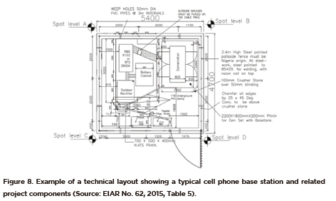 In any construction work, site planning is crucial in determining the location of proposed facilities (Umar et al., 2017). In the case of mobile telecommunications infrastructure, a site layout plan should indicate where fuel tanks, generators, electric transformers, cell phone masts, air conditioners and other components are located (Figure 8). With proper planning, the location of site facilities can be optimized in line with engineering considerations (Umar et al., 2017). In the present study, there were more technical representations in the form of site layouts and engineering designs (38%) relative to other spatial illustrations (Table 6). This may reflect the technical and engineering configuration of the infrastructure. However, some of the illustrations had inaccurate or missing scales. While 22% of the layouts were designed in different colours, the majority were presented in black and white (Figure 8) which may mean some features being shown are not easily discernible.