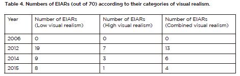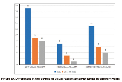In 30 EIARs, project activities were shown by spatial illustrations with low visual realism and geo-visualisation potential. These illustrations were in the form of engineering sketches and site layouts that include details on electrical power sources, transformers, electric generators, fuel reservoirs, air conditioning systems and cell phone masts. A low level of realism was also found in the display of Special Interest Areas. These areas were depicted mainly by site plans and engineering layouts in six EIARs. Figure 10 shows that while there is a decreasing trend for all types of visual realism in the years under consideration, no statistically significant variations were identified (chi-squared value 6.592, df=4, p>0.159).