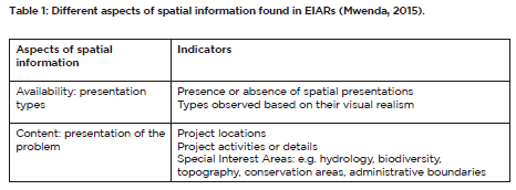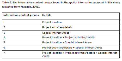 The information provided by the spatial representations in the EIARs were classified into 7 different groups (as indicated in Table 2), thus in line with the approach developed by Mncwabe (2021) (Table 7).