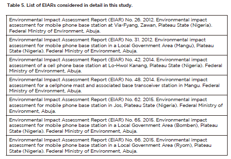 Out of 288 available EIARs requested from the Nigerian Ministry of Environment, only 80 were randomly sampled but of these 10 lacked spatial information, resulting in a total sample size of 70 (24% of the total). As shown In Table 4, the number of EIARs approved in each year varies, thus posing a limitation in the selection of reports. It is noted that, before 2006, there was only one EIAR compiled for the construction of mobile telecommunications infrastructure in Plateau State. Table 5 lists those EIARs considered in detail in this study.