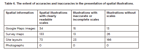 Table 6 indicates the degree of accuracy or inaccuracies in the presentation of the spatial information found in the EIARs. While the majority of spatial illustrations had proper scales and related cartographical detail, others had inaccurate scales and sometimes the scale was not indicated at all (Table 6). The lack of scale was highest amongst site layouts (n=166) and other engineering sketches, whereas fewer Google Maps (n=13) and survey maps (n=26) were affected by this problem.
