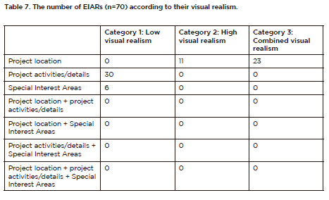 Overall, following the methods applied by Mwenda (2015) in Kenya and Mncwabe (2021) in South Africa, the spatial information was grouped into seven categories (Table 2) in addition to the three categories of visual realism (Table 3). In total, 36 EIARs used spatial information with low realism and 23 EIARs displayed combined levels of visual realism. However, those with high visual realism were relatively few, featuring in only 11 EIARs.