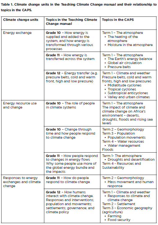 Comparison between the Teaching Climate Change manual and the FET Geography CAPS to determine climate change units