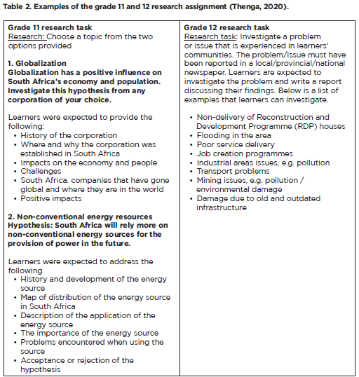 The integration of climate change and environmental sustainability concepts in grades 11 and 12 research tasks for school-based assessments as shown in Table 2 indicates the commitment of DBE to promote climate change education through assessment practices. The research tasks for grades 11 and 12 require learners to investigate environmental problems and suggest possible solutions which foster meaningful understanding and critical thinking. These tasks prepare learners to become informed citizens and encourage them to think of solutions relevant to solving environmental challenges such as climate change. Therefore, this shows that some of the cultural conditions of the DBE create opportunities for the implementation of climate change education.