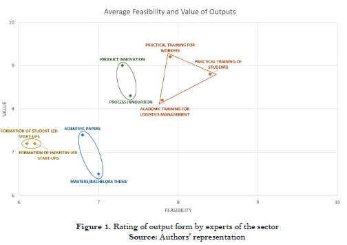 A qualitative measurement of JOINOLOG's results turned out to be a challenging goal. Since the centre aims to breed very different kinds of innovation, including academic impact, technological product innovation or formation of new business entities, there are little defining factors other than the pure success of achieving output at all, making the measurement exclusively dichotomous, 0 or 1 (a paper was published or not, a prototype was built or not, a start-up was established or it wasn't). To ensure a high percentage of finished outputs, the project team further conducted an open survey among stakeholders. The forms of output were to be rated both in feasibility and value to the logistics sector, from zero points to ten points (the latter indicating a very high value or feasibility). When observing the survey results, the clustering of the output groups indicates clear differences in preference and practicability as assessed by the participants, see Figure 1.
