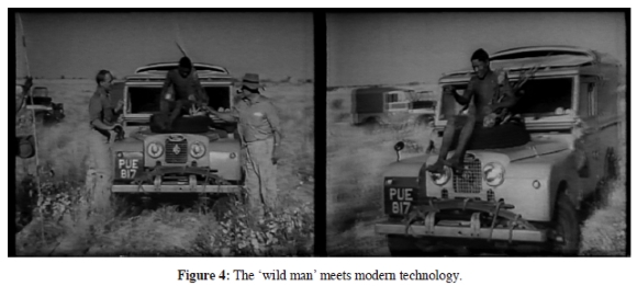 In Lost World, it is the 'wild man's' very atavism that makes him important, not a menace but an example to corrupt twentieth century humanity. Van der Post's longing for the atavistic 'wild man' (whilst apparently compassionate) was out of touch with developments in racial discourse in the West after World War II, which generally sought to diminish rather than emphasise racial differences between groups of people.29 In Lost World van der Post drew attention to the 'otherness' of the Bushmen in order to show his audience the wondrous presence of the past in its idealised Bushmen form, in which innocence and simplicity has survived for the benefit of the West's spiritual (dare I say it) development. In the film, this is illustrated pointedly when the 'wild man' perches outside the Landover, on the spare wheel fastened to the bonnet, although not before the Bushman in question has displayed great bemusement and not a little fear at the presence of the menacing vehicles. It does not take long for the plucky 'Wild Man' to overcome his fear though (Figure 4). He immediately trusts van der Post (or so we are assured in the narration) and as such he is able to direct to his home. But the 'wild' Bushman is so utterly isolated, and so different from the expedition member that he does not even recognise the motorcar, that ubiquitous symbol of modernity, and prefers to sit outside of it, away from the white occupants of the vehicle and their 'tame' (sic) Bushmen guide Dabe. 30