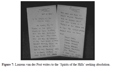 By petitioning these spirits for absolution for breaking the sacred law of the Hills, van der Post demonstrates a willingness to engage earnestly with the spiritual beliefs of the Bushmen whom he is seeking. In this way, he casts himself as the connective thread between Aboriginal Africans (Bushmen) and the West, between primitivism and technology, between spirituality and reason. The power of the film camera here should not be underestimated. By breaking down, the film camera is shown to be susceptible to the mystical power of the spirits of the Tsodilo Hills. Furthermore, the inclusion of the half-frames and jammed frames in the broadcast television series signifies that the evidence of this susceptibility is in the mechanism of the film itself. In this instance van der Post relies on the damaged frames to 'prove' the entire episode which is followed, as has been shown, by the expedition's shift to 'a new dimension of living'. For van der Post the filmmaking process was a useful means of showing his audience exactly what he was talking about: a mechanism not available to the writer of fiction, as will be discussed below.