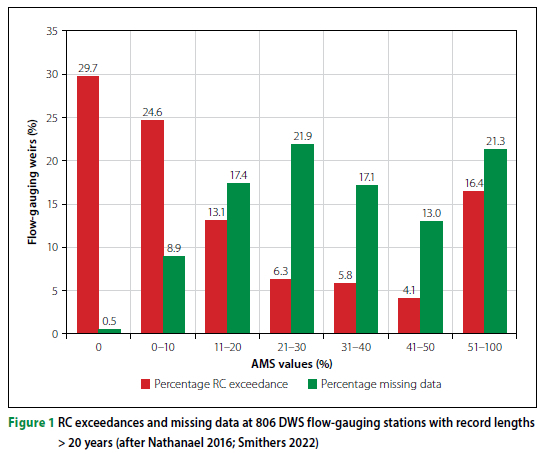 During flood events, the observed water levels often exceed the flow-gauging weir's designed measuring capacity or structural limit (Petersen-0verleir & Reitan 2009). Hence, the standard calibration of the flow-gauging weir will no longer be a true reflection of the actual discharges that had occurred during the flood events. The latter observed stage levels exceeding the maximum rated stage or flow depth (H) is a common problem in South Africa, as shown in Figure 1, where the RC exceed-ances and missing data are expressed as a percentage of the annual maximum series (AMS) at 806 DWS flow-gauging weirs with 20 or more years of record at each. For example, a standard SD RC, as shown in Figure 2, must then be extended beyond H to reflect the high discharges (Q) exceeding the designed measuring capacity. In general, such extensions are normally limited to bankfull flow conditions using appropriate indirect methods, while high flow extensions above bankfull flow conditions should only be considered in cases where the existing SD relationship includes floodplain flow on the full width of the floodplain (Gericke & Smithers 2017).