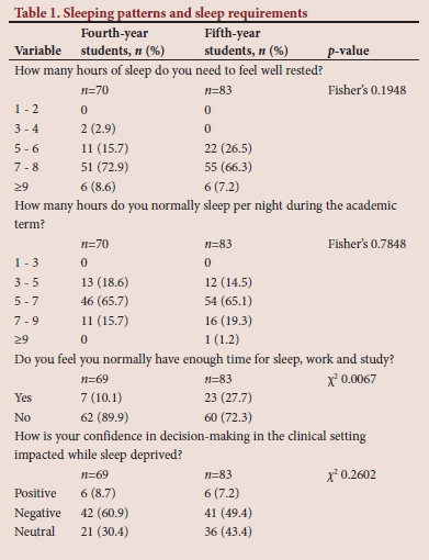 The majority of fourth-year (72.9%) and fifth-year (66.3%) respondents indicated that they needed 7 - 8 hours' sleep to feel well rested (Table 1). Two-thirds of fourth-year (65.7%) and fifth-year students (65.1%) reported that they usually slept 5 - 7 hours a night during the academic term. A statistically significantly higher percentage of fourth-year students (89.9%) felt they did not have enough time for sleep, work and study compared with 72.3% of fifth-year students. Both groups felt negative about their decision-making in the clinical setting when they were sleep deprived (fourth year - 60.9%; fifth year - 49.4%).