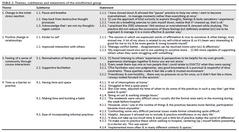 The themes of the MBI group's participants reflected positive changes in their initial stress reaction (theme 1), their relationships (theme 2) and a feeling of being part of a community because they had participated in the course (theme 3). The group reported experiencing several barriers to the development of a practice (theme 4).