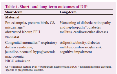 All types of DIP are associated with an increased risk of short-and long-term adverse outcomes for mother and child (Table 1), especially when glycaemic control is suboptimal. The severity and frequency of these adverse outcomes are higher in women with pregestational diabetes compared with GDM. Achieving adequate glycaemic control and appropriate gestational weight gain is critical to prevent pregnancy complications and adverse outcomes..[3]
